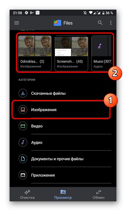 - Odprite upravitelja datotek. V našem primeru bodo na vrhu prikazani seznami z datotekami, ki so se nedavno spremenile. Kot lahko vidite, obstaja tudi imenik "Odnoklassniki"kamor je bila naložena izbrana slika. Če želite preklopiti na ogled preostalih slik, izberite kategorijo "Slike".